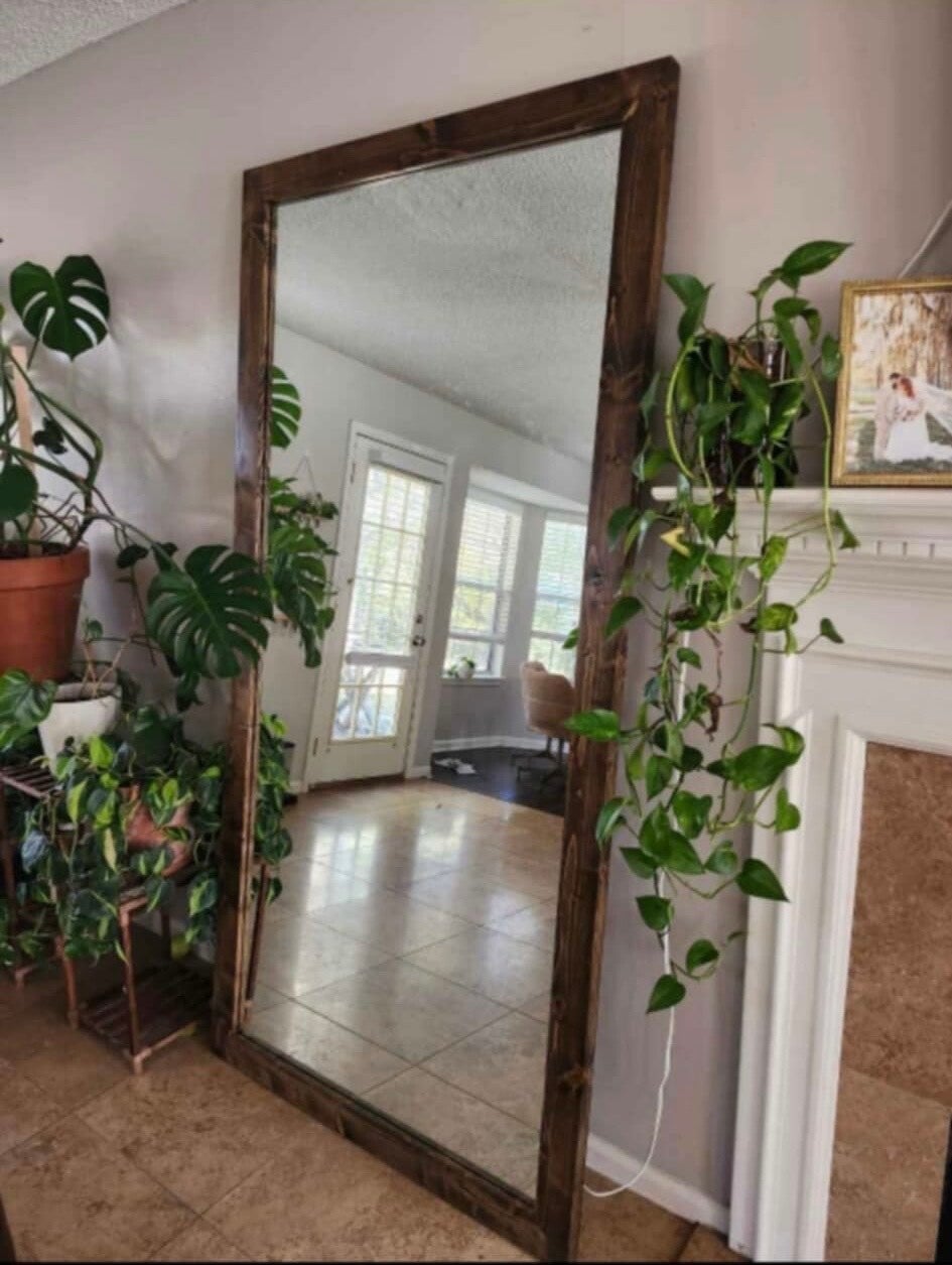 Crafted from solid pine, it is expertly stained and sealed for durability. The high-quality, heavy mirror is securely embedded within the frame, ensuring stability and a seamless design.